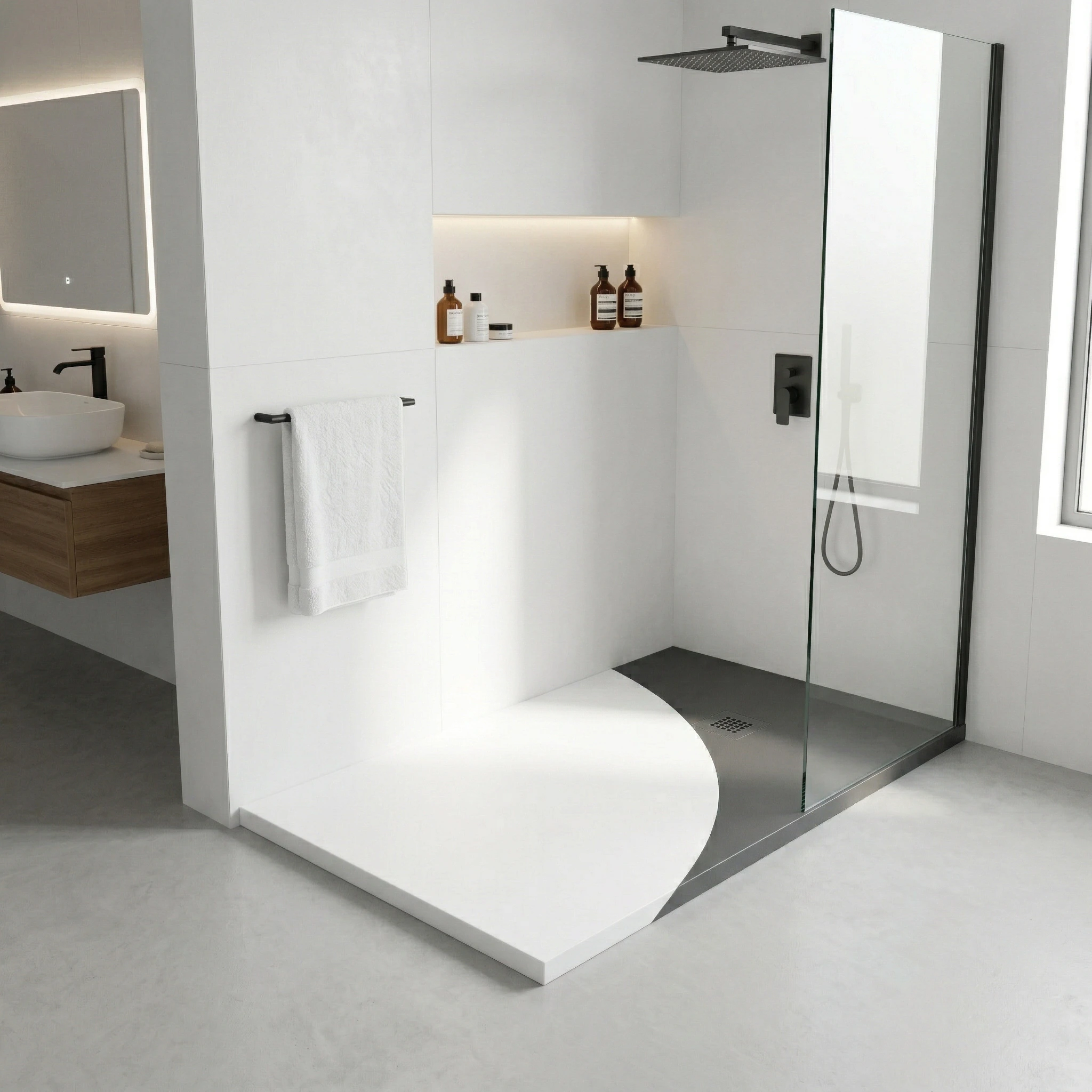 ImberDeck présente le modèle Palais Royal, l’expression ultime du luxe architectural au sein de notre Collection Signature 3D. Inspiré par les lignes épurées du mouvement Bauhaus, ce receveur bicolore joue sur un contraste chromatique radical entre le noir absolu et le blanc pur. Sa courbe parfaite ne se contente pas d’être un élément esthétique ; elle délimite visuellement l’espace, créant une structure ordonnée et sophistiquée qui transforme la douche en une pièce monumentale de votre intérieur.